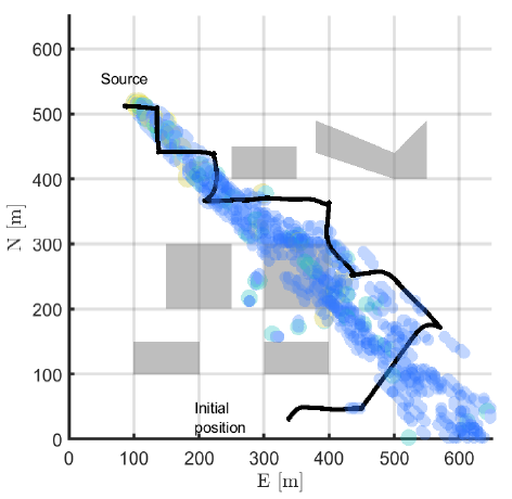 Intelligent Wind Estimation for Chemical Source LocalizationJ. Cooper, J. W. Hopwood, C. A. Woolsey, S. F. J. De Wekker, and M. DeVore79th Annual Forum & Technology Display, May 2023, pp. 1โ20.This paper presents a methodology to sense ambient wind conditions to assist in localizing the source of a released agent using small unmanned aerial systems (sUAS). The release of chemical, biological, radiological, or nuclear (CBRN) agents is a long-standing threat to populated areas and to ecosystems, in general. Such agents could be released intentionally by an adversary, accidentally, or by means of natural disaster. The technology and methods to detect, localize, and model release and dispersion of CBRN agents have been enhanced by integrating cross-disciplinary solutions using advances from sensor design, intelligent signal processing, control systems, vehicle design, chemical modeling, and atmospheric modeling. The miniaturization of sensors and sUAS has enabled the application of sUAS with a chemical sensor payload to detect and localize the source of CBRN agents. In many instances, this chemotaxis operation can be performed faster and more accurately with the addition of atmospheric information, such as ambient wind condition. The paper provides an overview of chemical source localization and current challenges which motivated this work, including operation in complex settings and turbulence. Analysis of these challenges from an atmospheric science perspective is summarized along with strategies to obtain accurate and useful wind estimates that assist in localizing the source quickly and efficiently. A description of the wind estimation approach, based on Bayesian estimation, is provided along with results from simulation studies utilizing realistic vehicle dynamics, wind, turbulence, and chemical plume models.
