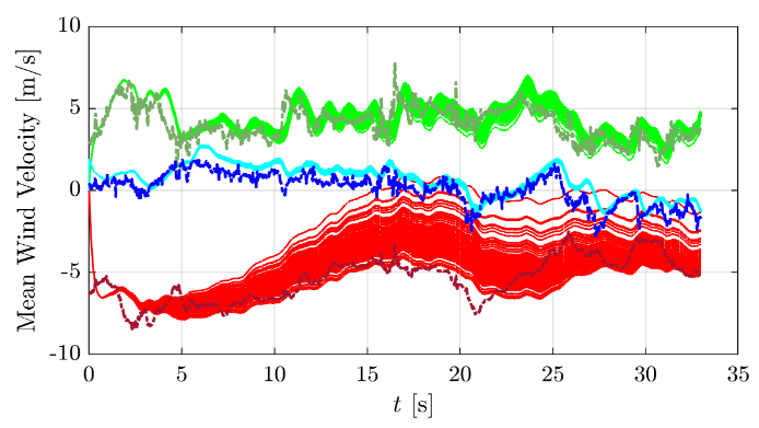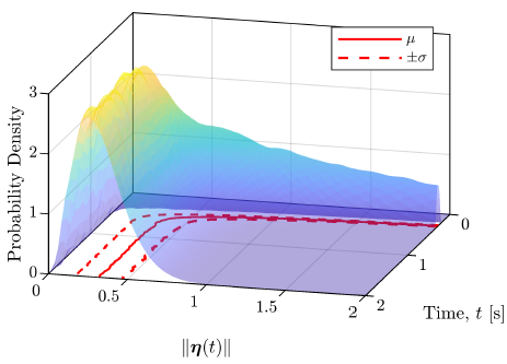 Uncertainty in Wind Estimates, Part 2: Hโ Filtering Using Generalized Polynomial ChaosK. C. Gahan, J. W. Hopwood, and C. A. WoolseyAIAA SciTech 2024 Forum, Jan. 2024.Indirect wind estimation onboard unmanned aerial systems (UASs) can be accomplished using existing air vehicle sensors along with a dynamic model of the UAS augmented with additional wind-related states. While many estimation approaches achieve desirable accuracy under the assumption of known system parameters, reducing the effect of parametric uncertainty on wind estimate precision is desirable and has not been thoroughly investigated. This paper describes the theory and process for using generalized polynomial chaos (gPC) to re-cast the dynamics of a system with non-deterministic parameters as a deterministic system. The concepts are applied to the problem of wind estimation and improving the precision of wind estimates over time due to known parametric uncertainties. In the multivariate case presented, a gPC H-infinity (Hโ) filter shows superiority over a nominal Hโ filter in terms of variance in estimates due to model parametric uncertainty. The error due to parametric uncertainty, as characterized by the variance in estimates from the mean, is reduced by an average of ย 25%.