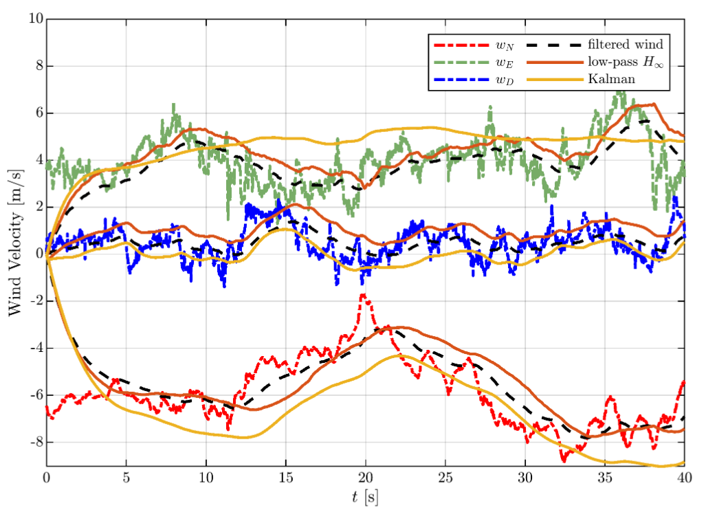 Wind Estimation Using an Hโ Filter with Fixed-Wing Aircraft Flight Test ResultsK. Gahan, J. W. Hopwood, and C. A. WoolseyAIAA SciTech 2023 Forum, Jan. 2023.Indirect wind estimation onboard unmanned aerial systems (UASs) can be accomplished using existing air vehicle sensors along with a dynamic model of the UAS augmented with additional wind-related states. It is often desired to extract a mean component of the wind the from frequency fluctuations (i.e. turbulence). Commonly, a variation of the Kalman filter is used, with explicit or implicit assumptions about the nature of the random wind velocity. This paper presents an H-infinity (Hโ) filtering approach to wind estimation which requires no assumptions about the statistics of the process or measurement noise. To specify the wind frequency content of interest a low-pass filter is incorporated. We develop the augmented UAS model in continuous-time, derive the Hโ filter, and introduce a Kalman filter for comparison. The filters are applied to data gathered during UAS flight tests and validated using a vaned air data unit onboard the aircraft. The Hโ filter provides quantitatively better estimates of the wind than the Kalman filter, with approximately 50% less root-mean-square (RMS) error in the majority of cases.