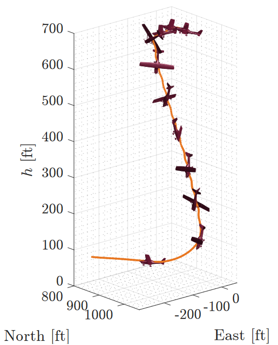 Stall Spin Flight Path Control Using Parallel Yaw-Periodic Linear Quadratic and Robust Hโ ControllersJ. W. Hopwood, J. L. Gresham, and C. A. WoolseyAIAA SciTech 2022 Forum, Jan. 2022.This paper presents the development and simulation of a robust, periodic linear control law to direct a fixed-wing unmanned aircraft in a stall spin along a desired path. As a flight termination sequence, a spin dissipates energy in a stable, controlled manner. Because control deflections are required to initiate and maintain such a spin, it may be possible, and desirable, to guide the aircraft toward a specific impact location by tilting the, otherwise vertical, axis of the spinning descent. Through augmentation of the dynamics with a measure of velocity vector direction error and the exploitation of a steady spin rate, a yaw-periodic linear quadratic regulator is designed to direct the spin. Then, a robust H-infinity controller is designed for a reduced set of aircraft states and implemented in parallel to robustly maintain the spin in the presence of exogenous disturbances and modeling errors. The combination of the two controllers is shown through simulation of the nonlinear closed-loop system to robustly follow a desired path in the presence of modeling errors and external disturbances.