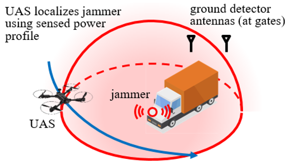 UAS-based Radio Frequency Interference Localization Using Power MeasurementsC. Smith, H. Yan, O. A. Hafez, J. W. Hopwood, and M. Joerger2024 International Technical Meeting of The Institute of Navigation, Feb. 2024, pp. 1169โ1183.This paper describes the development, implementation, and testing of a GNSS jammer localizer using power measurement profiles collected during un-crewed aerial system (UAS) fly-bys. A linearized measurement equation based on the Friis power transmission formula is derived in which RF channel propagation parameters are grouped into a single parameter for estimation. Synchronized power and UAS position measurements are processed in a batch-type sequential non-linear least squares algorithm for simultaneous estimation of static jammer position and received power model parameters. We develop a low size, weight, power, and cost (SWAP-C) quad-rotor UAS test bed that can collect and time-stamp power measurements with UAS position. Since GNSS jamming is illegal, a LoRa 868 MHz transmitter is used as a surrogate GNSS jammer during field testing โ providing Received Signal Strength Indicator (RSSI) measurements to the LoRa receiver onboard the UAS. Testing is conducted at the Virginia Tech Kentland Experimental Aerial Systems Lab, where emitter localization is evaluated for three different trajectories. Experimental performance analysis suggests that meter-level localization accuracy is achievable with prior knowledge on source location and by accounting for antenna gain pattern variations over time in the estimation process with a first order Gauss Markov Process.